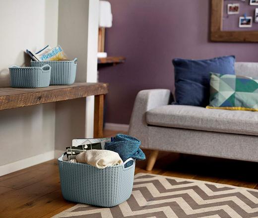 O cesto organizador Etna tem o trançado redondo e alças laterais. Indicado no cantinho da sala, ou do quarto, para compor a decoração do ambiente no chão. Tamanho 38 X 23 X 28 cm, cor azul claro
