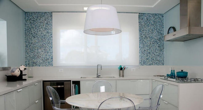1. Cozinha com parede com pastilhas de vidro azuis deixou o ambiente mais exclusivo e clean – Foto: Foto Juliana Pippi