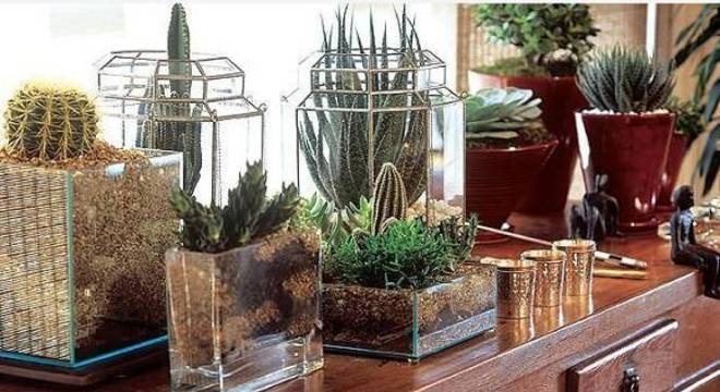 Note que são utilizadas diferentes espécies de cactos nessa decoração. A rusticidade do cacto interage com a modernidade dos vasos de vidro com formato quadrado.