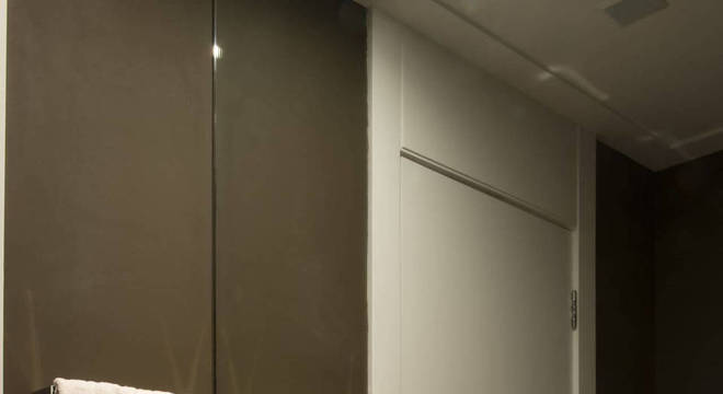 43. A toalha de lavabo escura contrasta bem com a madeira do gabinete. Projeto de Patrícia Azoni