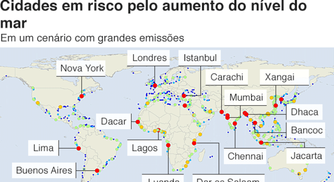 Em cenários de emissões mais altas, mesmo megacidades ricas como Nova York ou Xangai e grandes polos agrícolas tropicais como a região do Mekong, no sudeste asiático, enfrentarão riscos altos ou muito altos por causa da elevação do nível do mar.