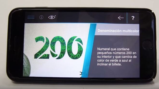 O aplicativo traz tutoriais para ensinar como saber que uma nota é falsa. O valor indicado em uma das pontas da nota deve mudar de cor, por exemplo. No caso da cédula de 200 pesos há uma variação entre tons de azul e verde