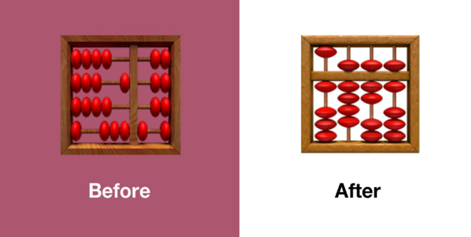 O ábaco, uma espécie de calculadora rudimentar, também teve seu design modificado. Antes, as contas estavam posicionadas horizontalmente e agora o emoji está na vertical
