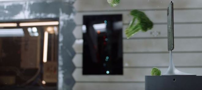 Na sequência, diversos tipos de alimentos são jogados contra o aparelho