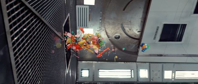 Em seguida, uma chuva de objetos de plástico é lançada e o aparelho segue intacto