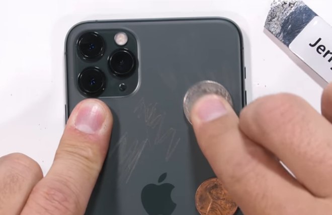 Na parte traseira do iPhone 11 Pro Max, foram utilizados diversos objetos, entre eles uma lâmina e um estile. Todos causaram pequenos arranhões