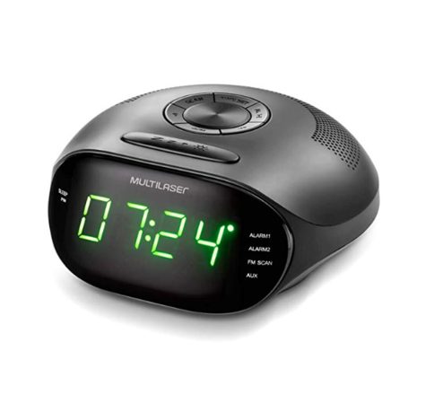 A Caixa de Som e Relógio possui compartilhamento de pilha e é bivolt