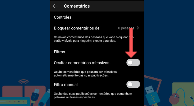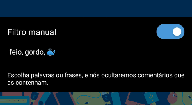 Caso o usuário sinta necessita de ampliar esses filtros de comentários, ele pode realizar o filtro manualmente. Assim, o usuário pode ocultar palavras e até emojis que consideram ofensivas ou inadequadas
