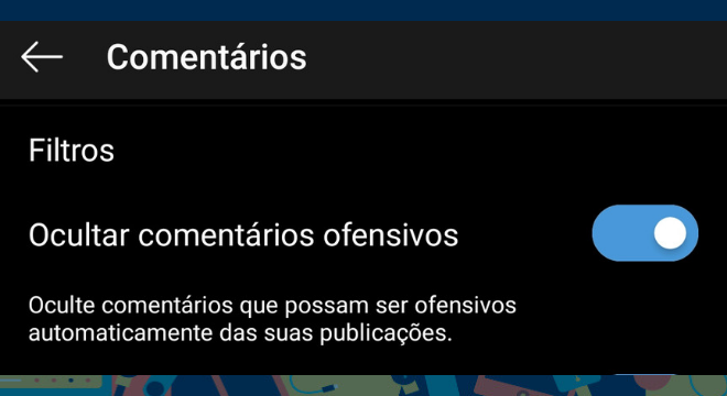 Quando a opção filtro manual é ativada na rede, automaticamente, o Instagram oferece outra alternativa de ocultação de comentários, que é as palavras mais denunciadas na rede. Com isso, o usuário amplia a ocultação de comentários ofensivos e se protege de perfis maldosos