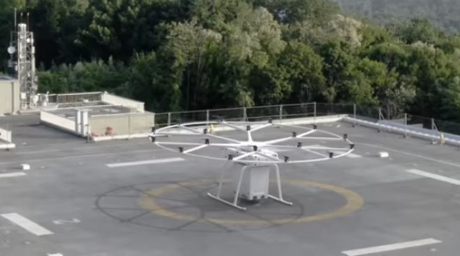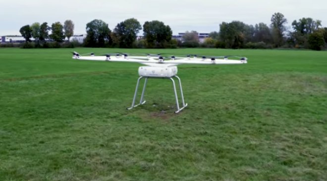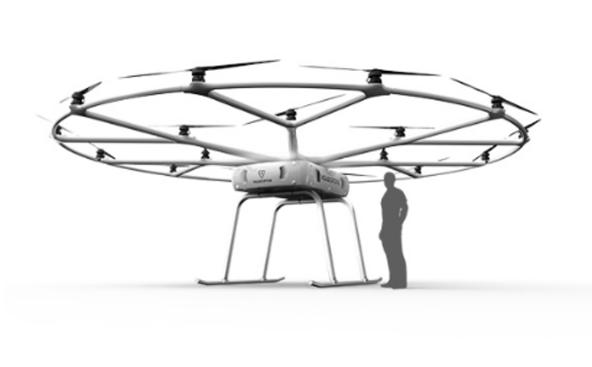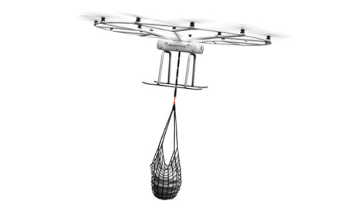 A Volocopter, empresa alemã de mobilidade aérea, desenvolveu o VoloDrone, um drone gigante de 2,3 metros de altura e 9,3 metros de diâmetro