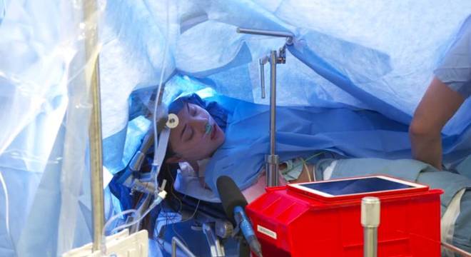 A paciente ficou acordada durante a cirurgia para garantir que regiões do cérebro responsáveis pelo movimento ou pela fala, por exemplo, fossem afetadas.