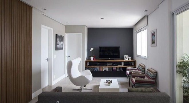 7. Poltrona decorativa para sala de tv e painel branco. Fonte: Pinterest