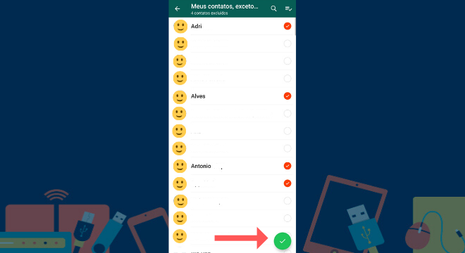 Agora, selecione contato por contato para excluir da opção de poder te adicionar em grupos. Após montar a lista, confirme no ícone verde no canto inferior direito da tela. Pronto, agora só os conatos selecionados podem te adicionar em grupos de conversa