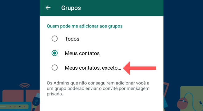 Caso queira limitar quais amigos podem adicionar seu número em um grupo, toque na opção Meus contatos, exceto... para ser direcionado a outra tela