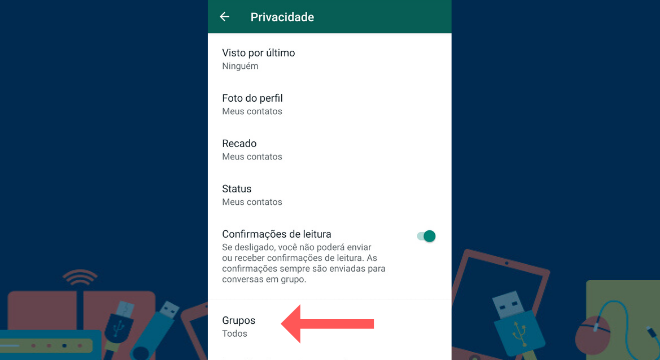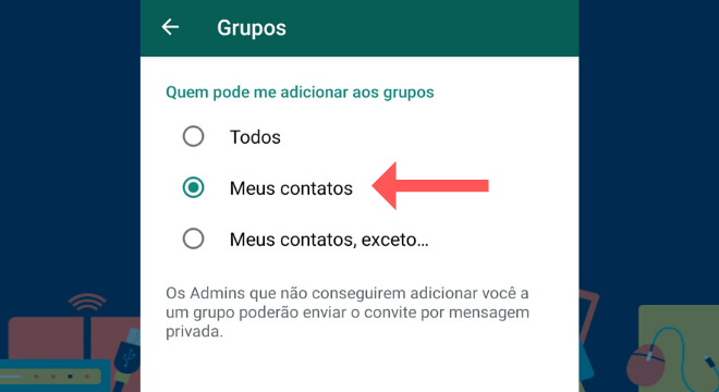 Em Grupos, provavelmente estará selecionado a opção Todos. Para alterar e permitir que apenas os contatos salvos na agenda te adicionem em grupos de conversa, toque em Meus contatos. Se o administrador do grupo que não conseguir adicionar o usuário, é possível enviar um convite por mensagem privada