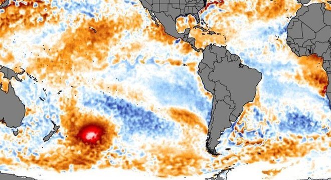 Ela é tão grande que ocuparia um pouco mais da metade do México e duas vezes a superfície do Estado de Minas Gerais. Satélites mostram que uma área gigantesca e vermelha no Pacífico, perto da Nova Zelândia, está se locomovendo em direção à América do Sul.
