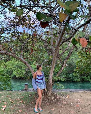 Yasmin Brunet posou com biquíni azul estampado com babados e calcinha no estilo 'empina bumbum'