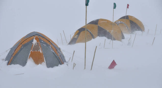 Este é relativamente leve para a Antártica, mas ainda envolve três dias de vento com rajadas de até 80 km/h. Sopram enormes correntes de neve no acampamento, cobrindo o equipamento, e todo o trabalho é interrompido.