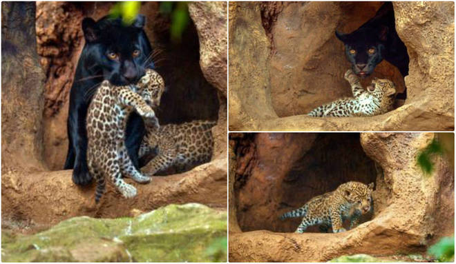 A mãe tem uma pelagem de cor diferente dos dois filhotes apenas por uma condição genética. As onças podem ter tanto o pelo preto com machas também escuras, quanto o pelo amarelando com manchas, como é o caso de Gulliver