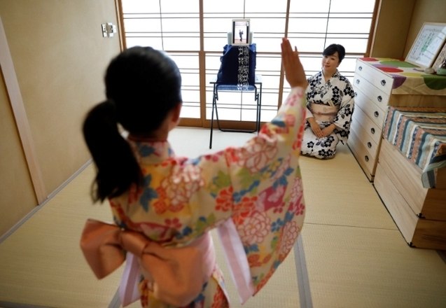Komaki Yamashita, 49 anos, e sua Filha Konoha, 19 anos, fazem aula de dança com uma professor pela internet. As duas se dedicam à tradicional dança japonesa Takujiro Hanayagi. A família está evitando sair de casa, mas as duas afirmam sair um pouco para caminhar no parque