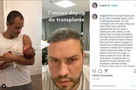 "Bom dia! Sete meses após eu ter feito o implante capilar com o dr @thiagobiancoleal . Fiz uma montagem com um vídeo antigo que achei ontem com a Stellinha pequenininha pra vocês verem a diferença do meu cabelo. Eu não ganho nada com essas divulgações, mas faço isto pra incentivar pessoas que têm vontade de fazer o mesmo mas ainda não criaram coragem. O trabalho do dr @thiagobiancoleal é impecável e merece ser divulgado o máximo possível porque além do meu médico, se tornou um amigo. A técnica usada foi a FUE. Não tem corte algum. Na página dele vocês podem ver muitos exemplos dos resultados e ele também atende mulheres. Sobre valores, isso somente o médico pode te responder porque cada caso é diferente", escreveu Maguila.