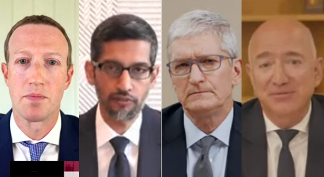 Os CEOs Mark Zuckerberg (Facebook), Sundar Pichai (Google), Tim Cook (Apple) e Jeff Bezos (Amazon) participaram de uma audiência na quarta-feira (29), promovido pela comissão de justiça da Câmara dos Deputados norte-americana.