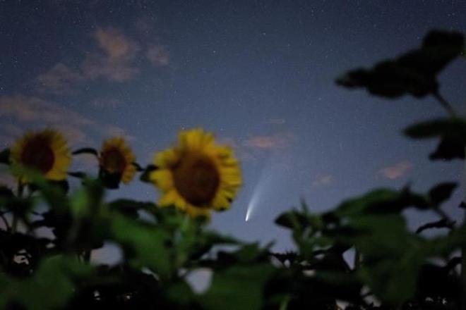 Na Áustria, o cometa foi fotografado sobre uma plantação de girassóis