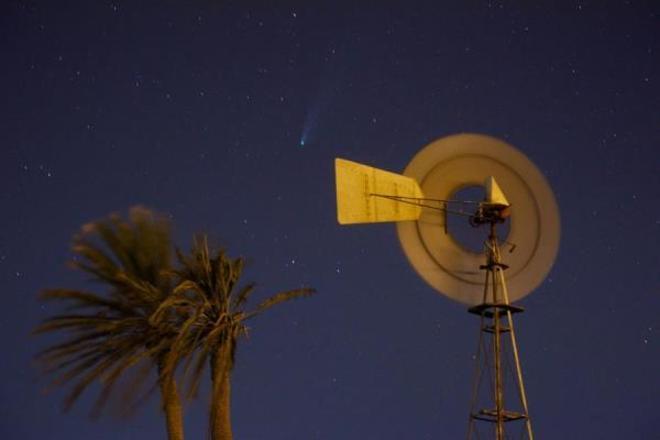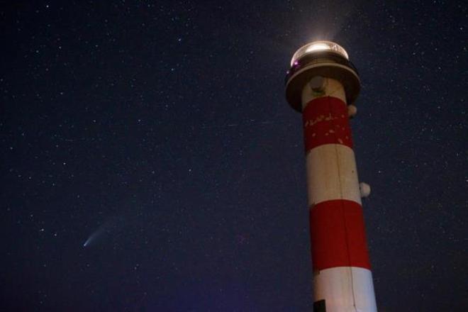 Também na Espanha, uma foto do cometa em uma observação próxima do farol El Tostón, na cidade de El Cotillo
