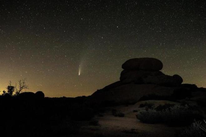 Nos EUA, assim que o sol baixou no horizonte do Parque Nacional Joshua Tree, na Califórnia, a cauda do Neowise brilhou no céu