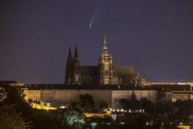 Em Praga, capital da República Tcheca, o cometa Neowise foi fotografado no momento em que passava ao fundo do Castelo de Praga, cartão postal da cidade