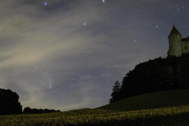 Na Suíça, o cometa foi fotografado com o céu ainda claro e com o castelo de Champvent ao fundo