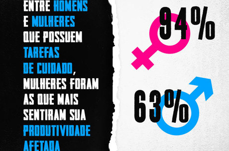 Um dos dados mais reveladores da pesquisa diz respeito aos entrevistados responsáveis pelo cuidado de outros familiares como crianças, idosos ou parentes em grupo de risco. Entre as mulheres que se disseram responsáveis pelo cuidado de terceiros, 94% sentiram sua produtividade afetada. Já entre os homens, o índice caiu para 63%.