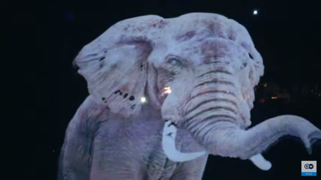 Por outro lado, em um futuro ainda longínquo, Marins imagina que as TVs contarão com recursos holográficos, isto é, exibirão imagens ópticas tridimensionais na forma de hologramas. A holografia já é uma realidade, mas ainda não está disponível comercialmente. A imagem acima mostra um holograma de um elefante, exibido em 2019 no picadeiro do circo alemão Roncalli