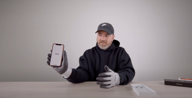 Após colocar luvas emborrachadas para proteger as mãos de possíveis estilhaços e para evitar que o aparelho escorregasse, o iPhone 12 e 12 Pro foram colocados à prova