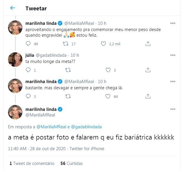Uma fã quis saber se ela está longe da meta e Marilia respondeu: "Bastante. Mas devagar e sempre a gente chega lá. A meta é postar foto e falarem que fiz bariátrica."