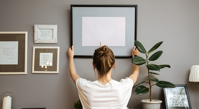 Ganchos e velcros adesivosSabe aqueles ganchos e velcros adesivos que, normalmente, são aplicados como cabideiros nas paredes? Usando a criatividade, eles podem ganhar novas utilidades, servindo também para fixar seus quadros na altura em que desejar. No entanto, é preciso ressaltar que eles não aguentam muito peso e você deve testar para garantir que não caiam.