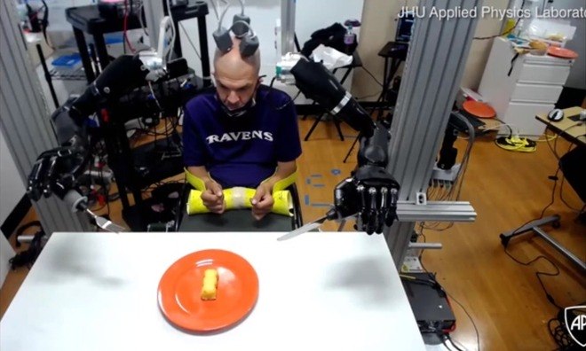 Em 2019, Robert Chmielewski se ofereceu para um programa de pesquisa da JHM e passou por uma cirurgia de dez horas para implantar seis eletrodos em seu cérebro para controlar um par de braços robóticos