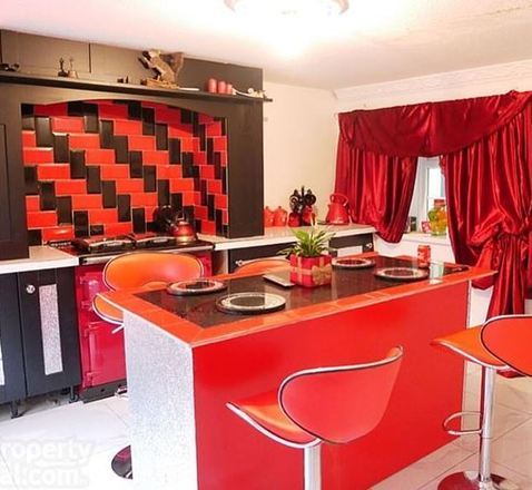 Parece que alguém aqui gosta de vermelho. Mas e essa cortina de cetim na cozinha?