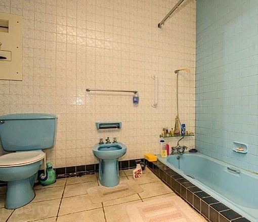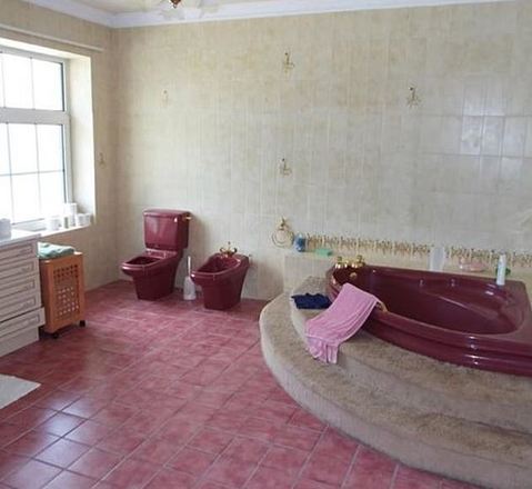 Apesar de espaçoso, a cor magenta, os degraus e os azulejos ao redor da banheira mostram como a construção é antiga