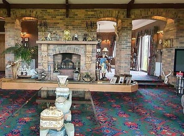 É tanta informação entre carpete florido, parede de pedras e objetos dourados que o ambiente vira uma poluição visual