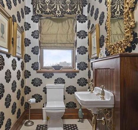 O papel de parede estampado em ambiente pequeno conflita com os quadros e a moldura cheia de detalhes