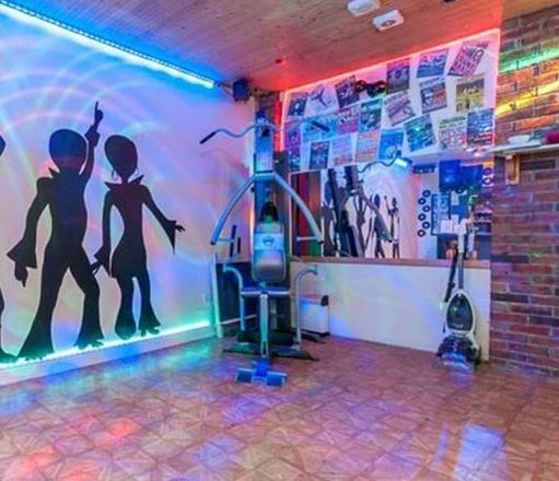 Decoração de discoteca para a sala de ginástica. Tem até neon!