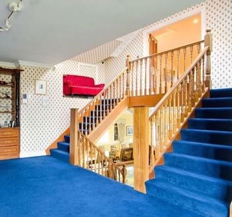 Parede estampada e carpete azul royal no piso intermediário da casa