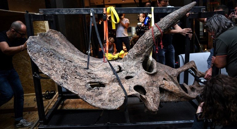 O esqueleto do maior dinossauro triceratops conhecido até o momento, Big John, estará em exibição em Paris antes de seu leilão em outubro, informou a casa de leilões nesta terça-feira (31).